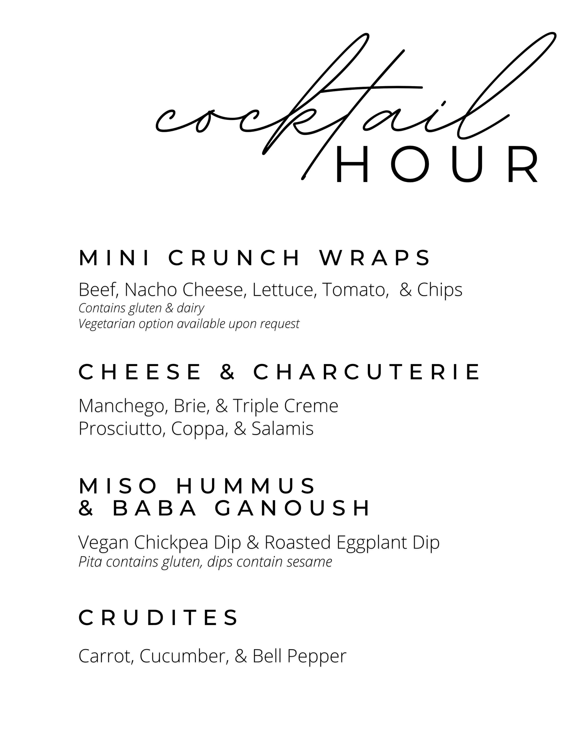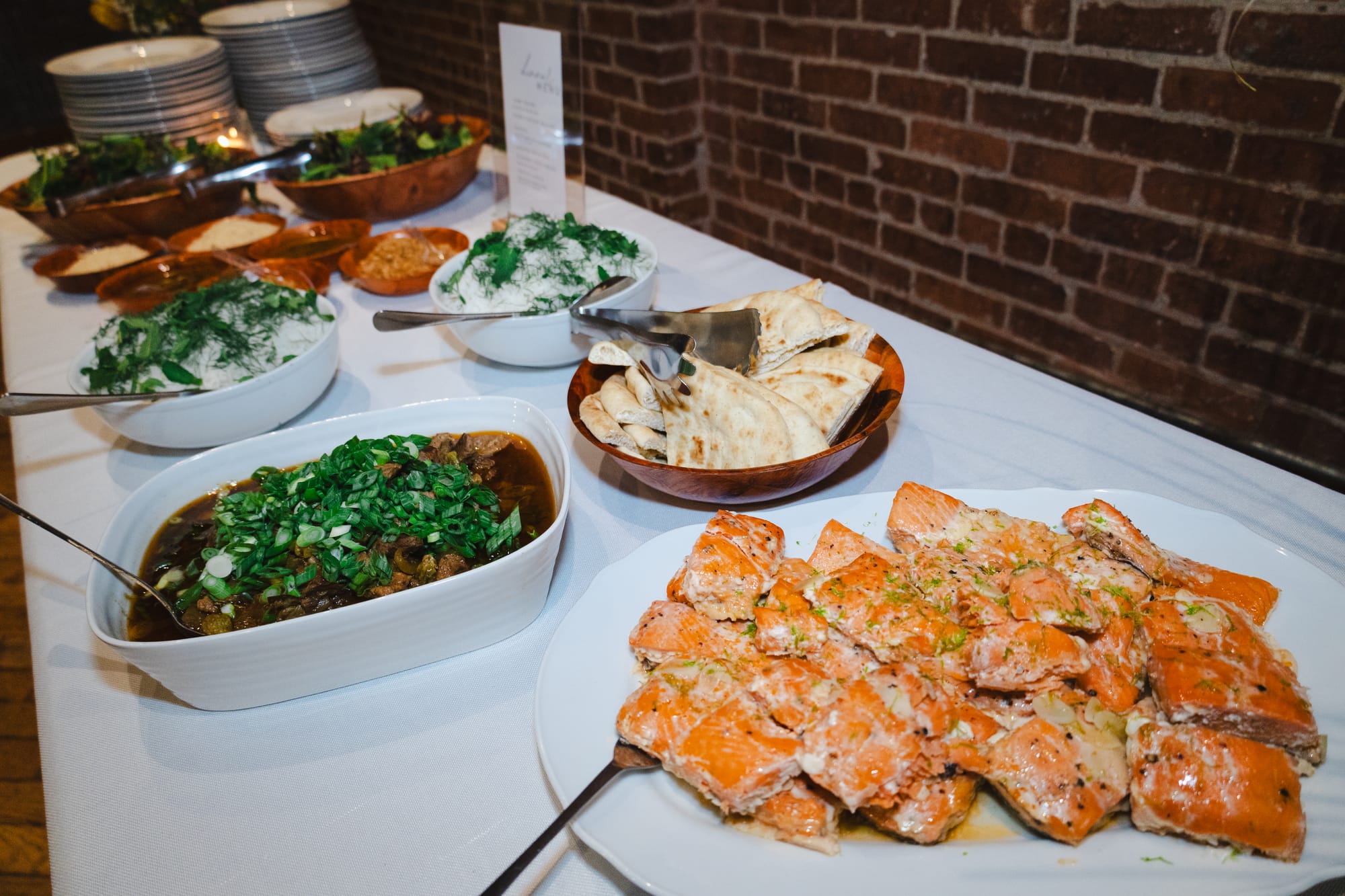 Katherine and Julie came to us with a request for an easy buffet inspired by the Mediterranean. Guests were welcomed to the space with cocktail hour and grazing table featuring mini-crunchwraps, an item that Katherine personally requested. The vibe was sweet and caring, the welcome table had coloring activities and stickers for the youngest guests.