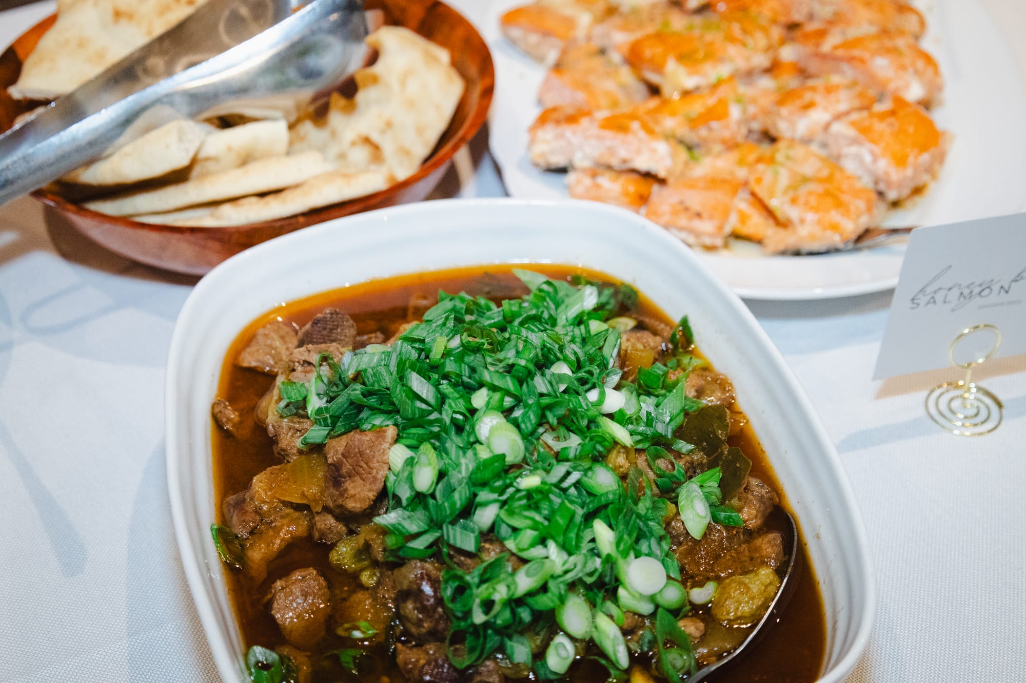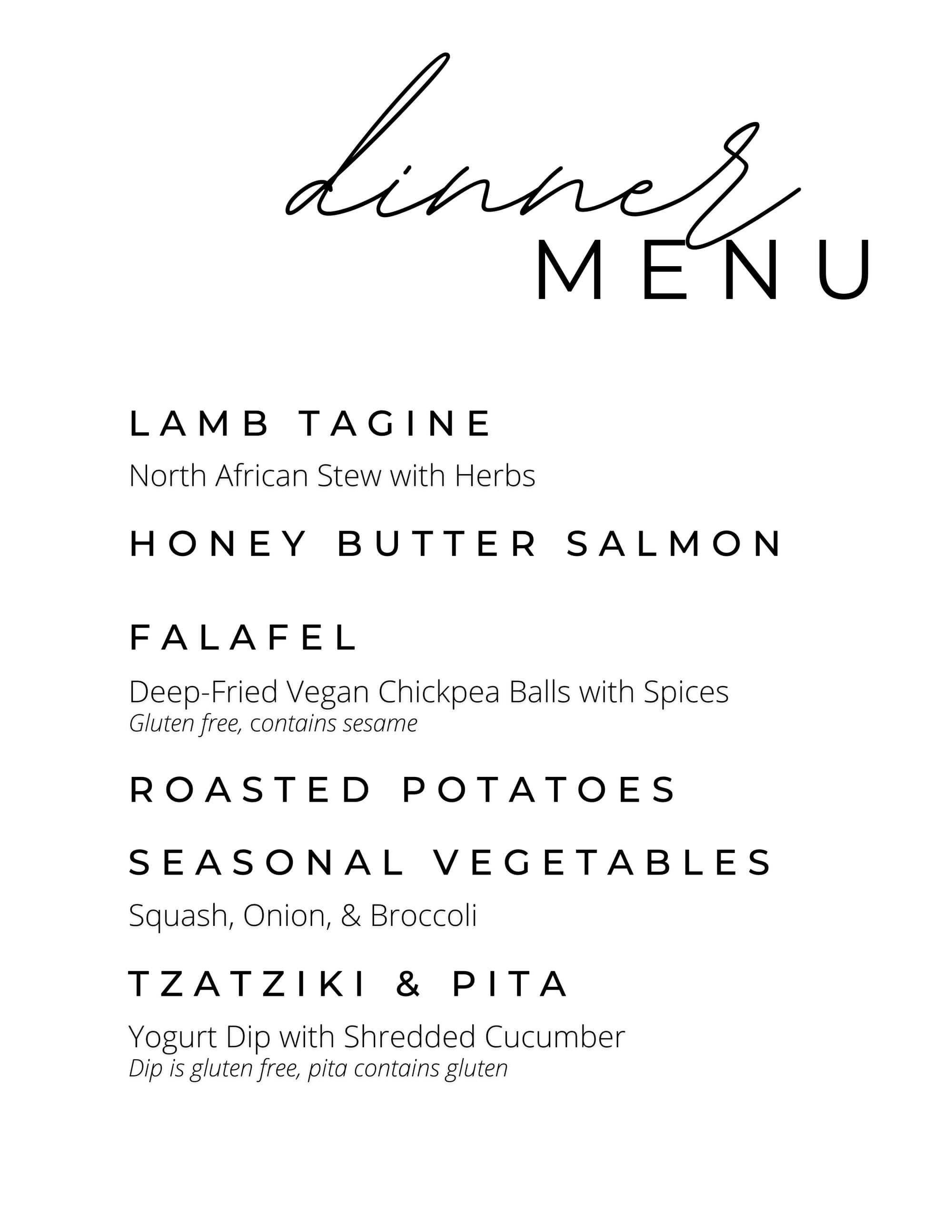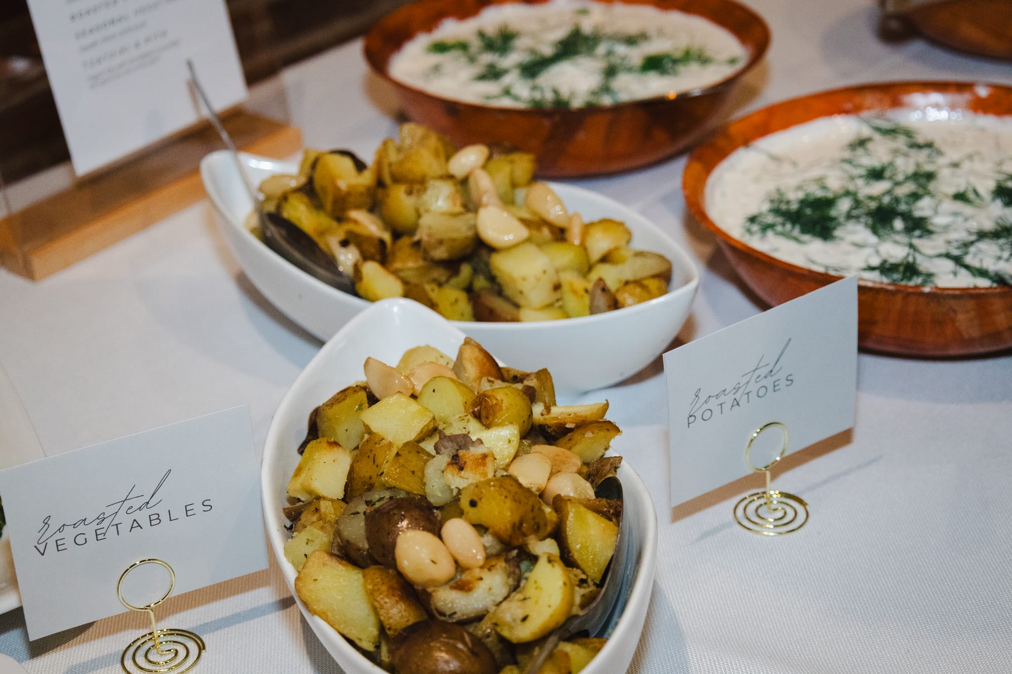 For the vegetarian guests, we made lots of roasted seasonal vegetables and our signature roasted potatoes with garlic confit. We dress them with a herby oil packed with thyme and sage. To accompany them, we served tzatziki with lots of fresh dill.