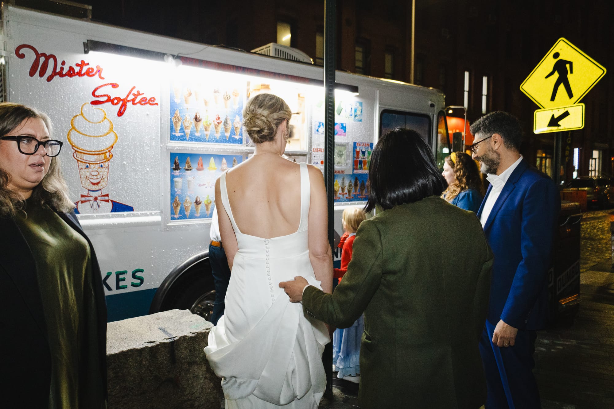 Following a heartfelt ceremony, she also displayed her musical prowess as a violinist in a beautiful string quartet. Dinner featured lamb tagine, honey butter salmon, and falafel with many sides. For dessert, a Mister Softee truck pulled up outside for guests to order any cone they wanted.
