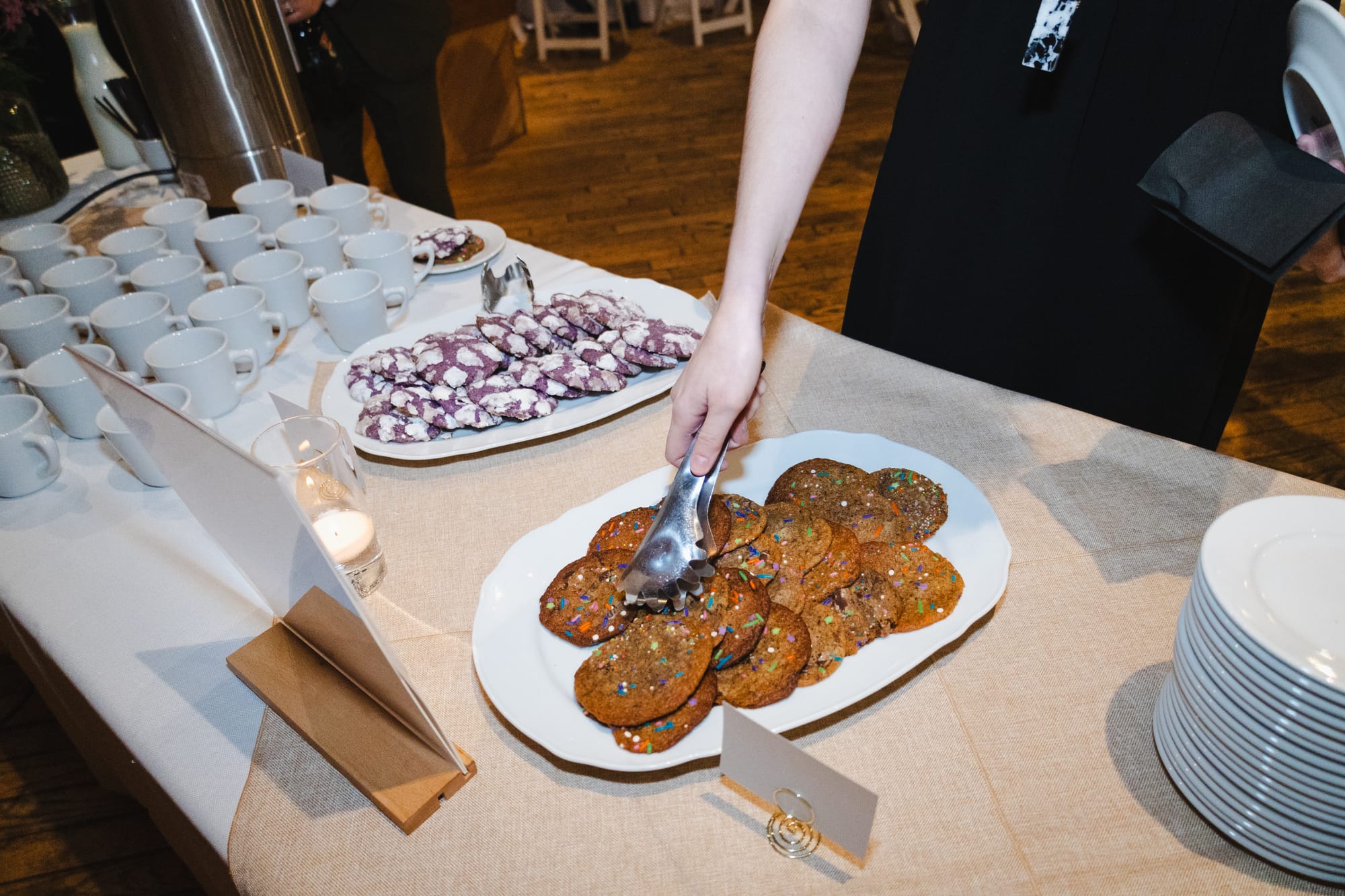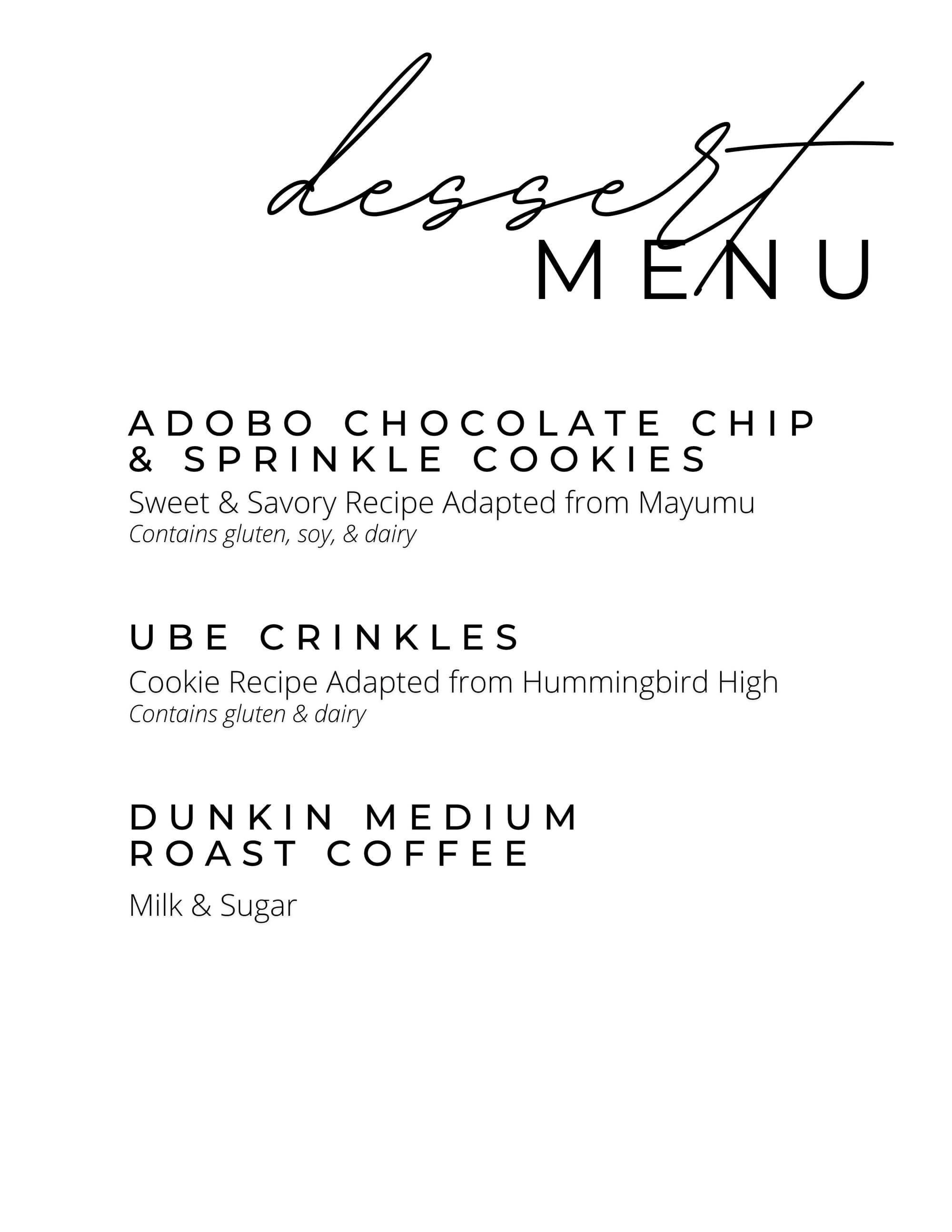 For dessert, Katherine and Julie simply wanted coffee and cookies because the main attraction was the Mister Softee truck parked outside the venue. One of the wedding guests was none other than Michelle Lopez, a beloved baker known on the internet as Hummingbird High. Julie requested that we serve her ube crinkle cookies. To accompany them, we suggested to pair it with another Filipino flavored cookie. We adapted Abi Balingit's adobo chocolate chip cookies with sprinkles. We asked our sous chef Kate Ray to help us scale and bake hundreds of these treats.