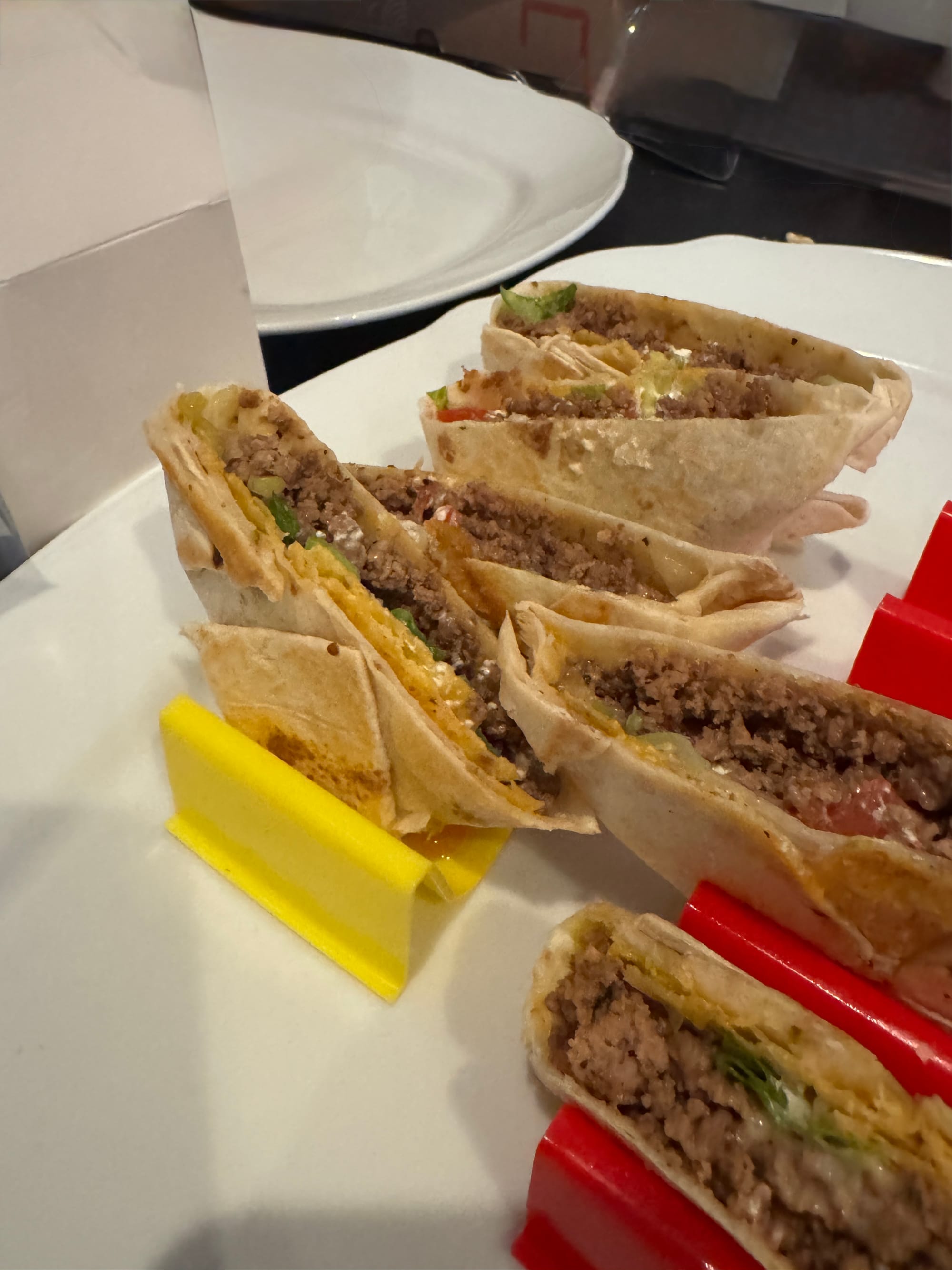 Katherine attended one of our crunchwrap dinner parties, and the memory was so strong that she wanted mini versions at her wedding. We had assembly line to produce 100 of them for cocktail hour. We folded cumin-scented ground beef with sour cream, lettuce, tomato, cheese, a tortilla chip, and salsa in flour tortillas. We sealed them in a hot panini press and cut them in half for guests to enjoy.