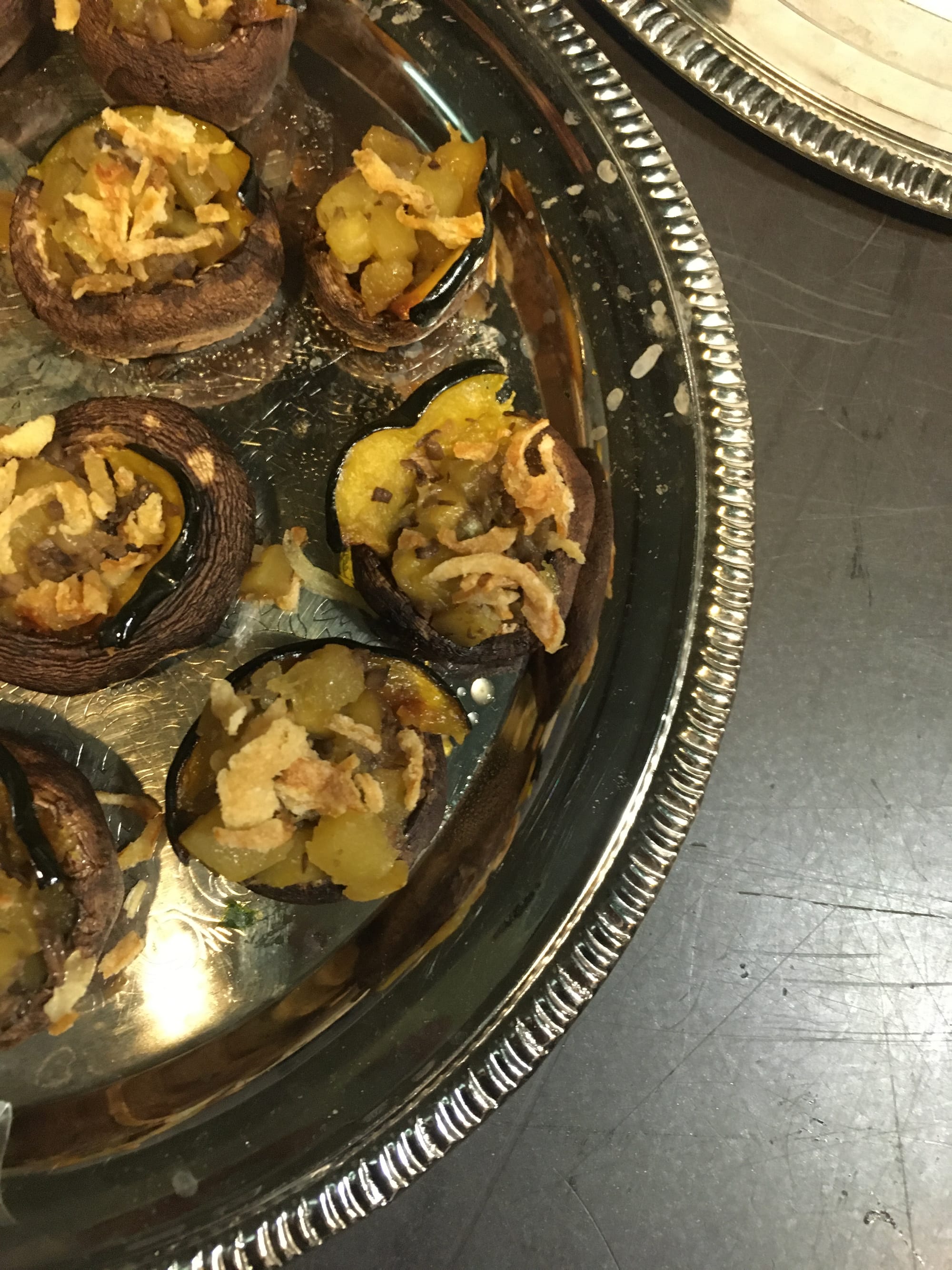 Our vegan stuffed cremini mushrooms were roasted and then filled with cubed potato, acorn squash, and crispy onions.