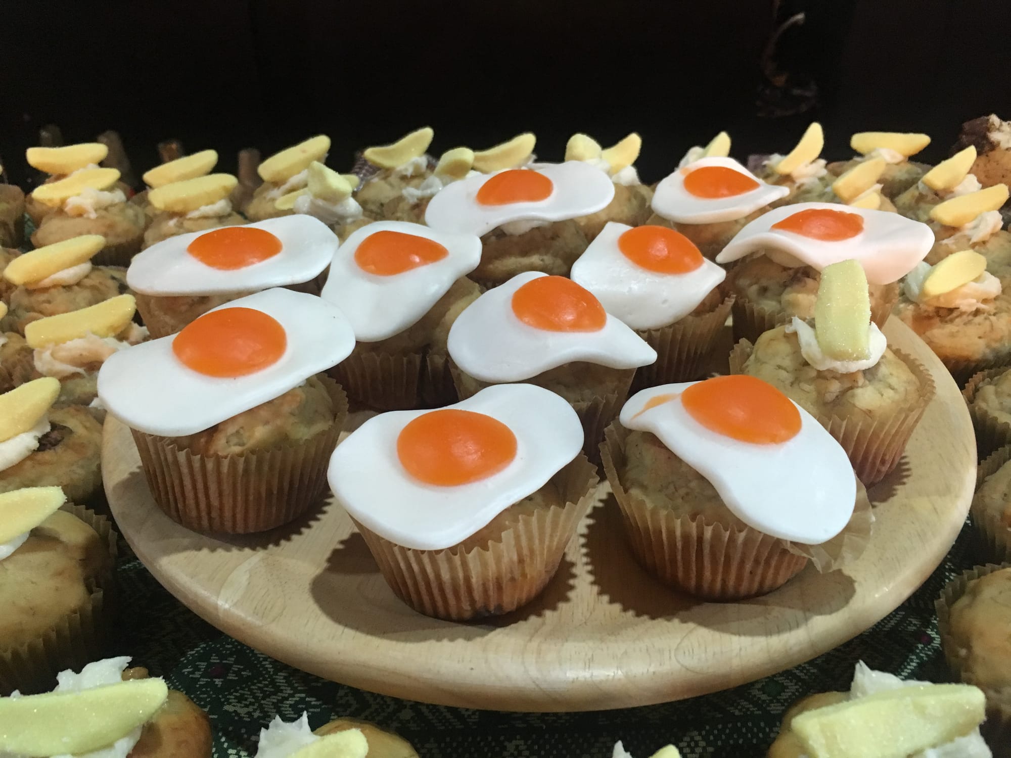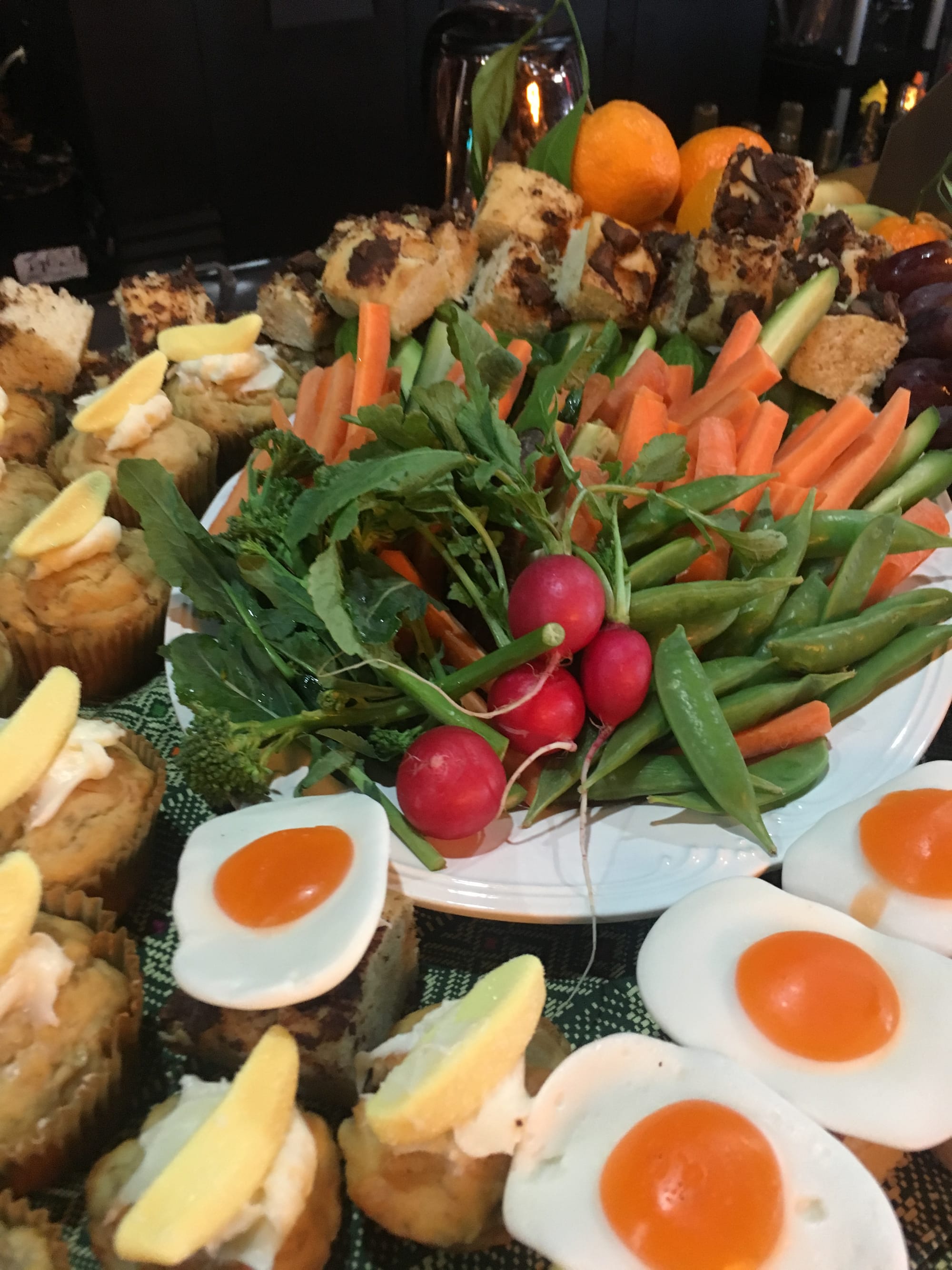The highlight, we think, was the 100 banana nut muffins we baked that morning. We used a little cream cheese frosting to adhere gummy fried eggs and bananas in honor of Salvador Dalí. We also baked thick and fluffy sheet pancakes with chocolate chips. This format is easy to transport and slice into squares for easy snacking.
