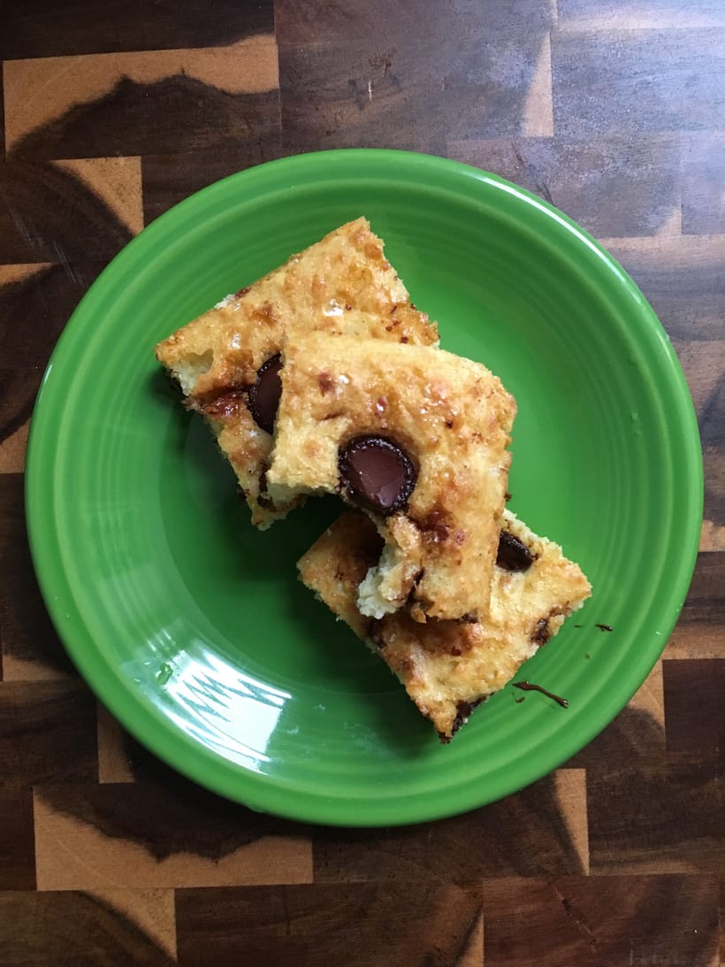 You can convert any pancake recipe into a sliceable cake! Simply preheat the oven to 425F and use 2 cups pancake mix (and follow the directions for that amount on the box). Top it with chocolate chips, peanut brittle, or sprinkles.